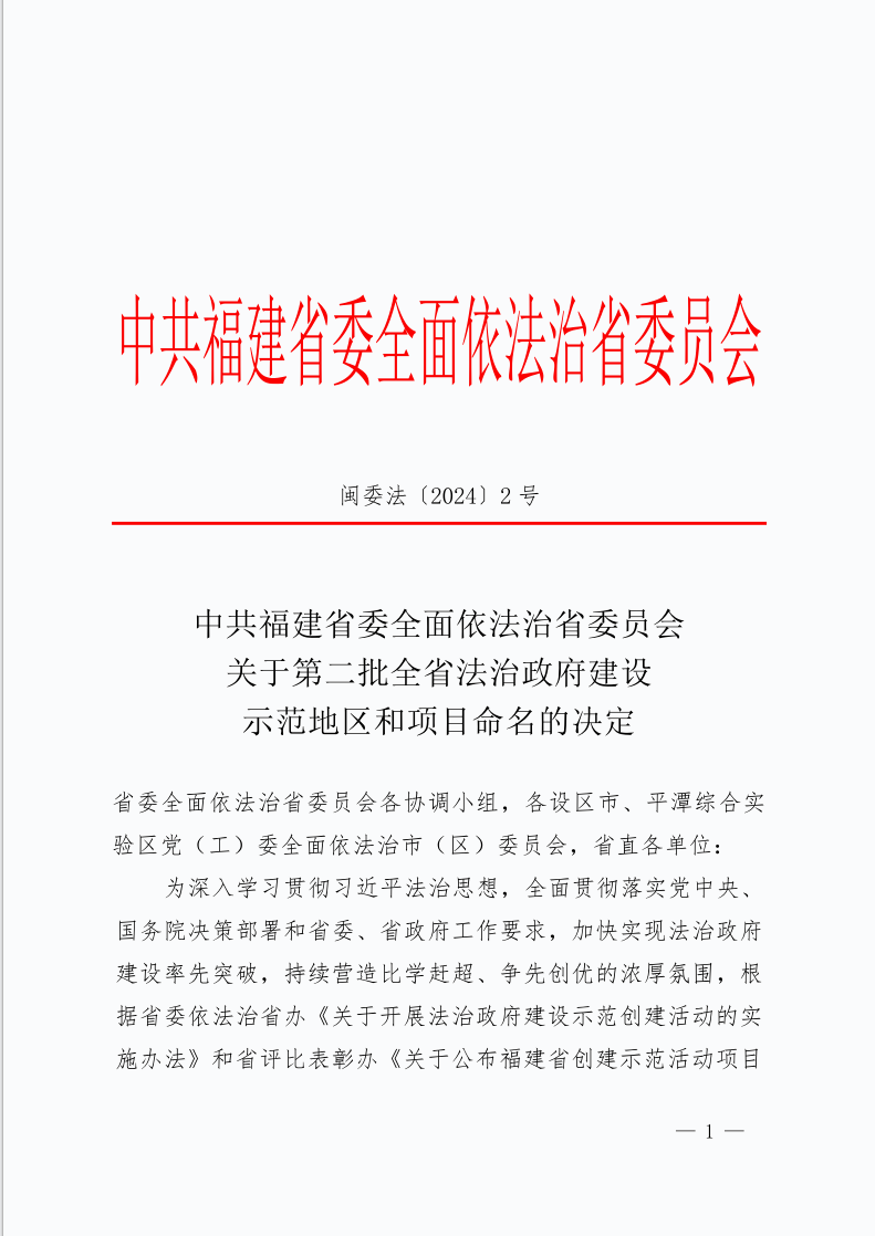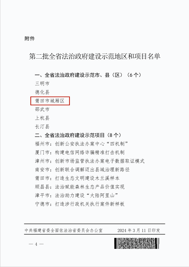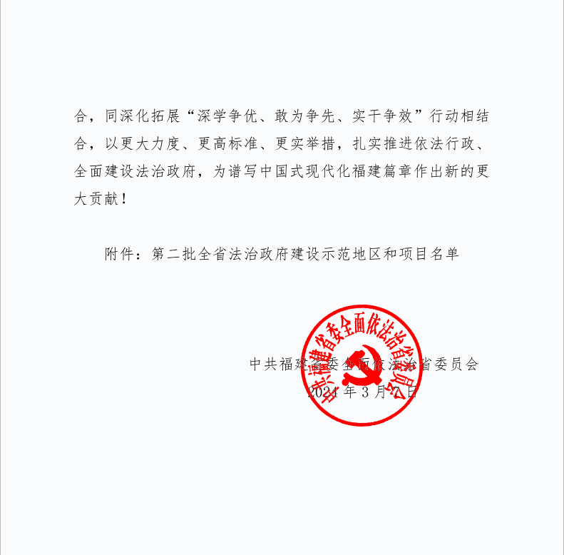 近日,福建省委依法治省委员会印发通知,对第二批全省法治政府建设示范地区和项目予以命名。其中,莆田市城厢区被认定为“全省法治政府建设示范市、县(区)”,成为莆田市首个获此殊荣的县区。