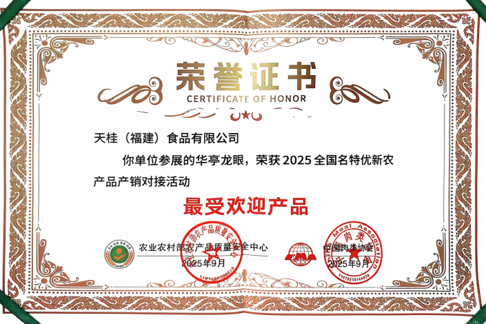 在刚刚落幕的2025年全国名特优新农产品展销会上天桂「松风本龙眼」实力出圈荣获大会官方认证“最受欢迎产品”称号