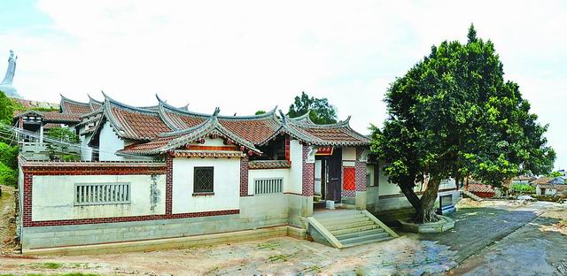 祖祠右侧则是妈祖祖厝(如图),系妈祖曾祖父告老隐退所建。庭院开阔,主堂古色古香,书斋、厢房、花园、梳妆楼等幽静雅致。2010年,祖厝北侧祖祠 山又建立一尊青年妈祖林默石雕像。她基高2.8米,寓意在世28个春秋;底座高3.23米,寓意