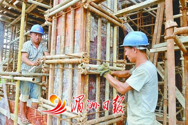夏日炎炎,位于城厢区华林经济开发区的市重点项目———华林电商城的工地上,施工现场一片热火朝天。一座6层高的楼房已经封顶,正待褪去脚手架和外围绿色的防坠网。另一侧,数十名建筑工人正在忙着将模板围着钢筋固定,准备浇筑水泥。钢筋加工区、水泥搅拌区,工人们紧张有序地忙碌着。工地南侧,地面被挖出一块深达五六米的巨大地基,周边全部用水泥浇灌。“哐当、哐当”地基中央一台打桩机有节奏地工作着。场地中央,3架数十米高的塔吊已经搭起,几台挖掘机不停地挥舞着巨臂,满载渣土的大卡车在工地上进进出出。