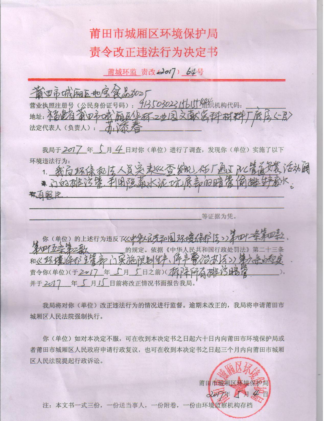 莆田市城厢区地宝食品加工厂责令改正违法行为决定书(莆城环监责改[2017]64号)