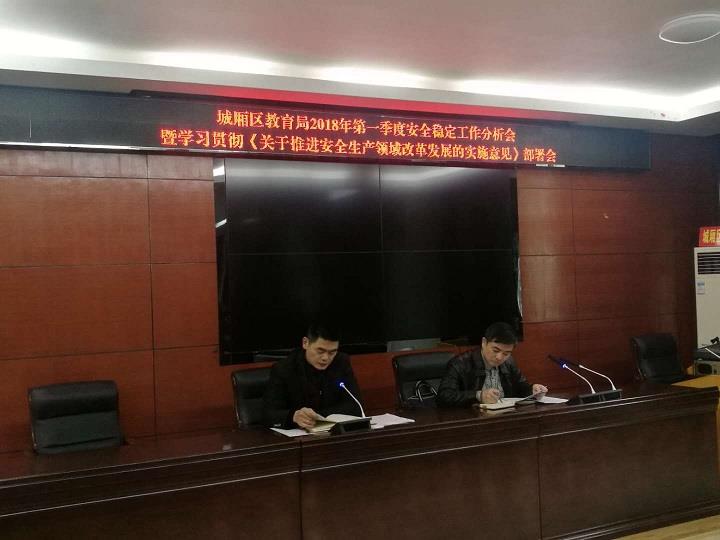 为贯彻落实市教育局关于期末及寒假期间学校安全工作的部署要求,确保全区教育系统安全稳定,2018年1月31日上午,区教育局召开2018年全区教育系统第一季度学校安全稳定分析会暨学习贯彻市委市政府《关于推进安全生产领域改革发展的实施意见》部署会。区教育局局长刘永贤出席,副局长陈进主持会议。全区所有公办、民办学校的校(园)长及安保负责人参加了会议。