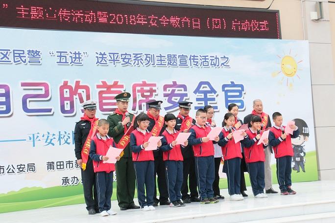 3月26日下午,莆田市“做自己的首席安全官—平安校园行主题宣传活动启动仪式”在逸夫实验小学举行,市政府办公室副主任范建忠,市公安局副局长柳建忠,市教育局副局长柯毓奇,区教育局局长刘永贤等领导,各县、区(管委会)教育局分管领导,市直学校分管领导及安保室负责人,逸夫实验小学全体师生参加。