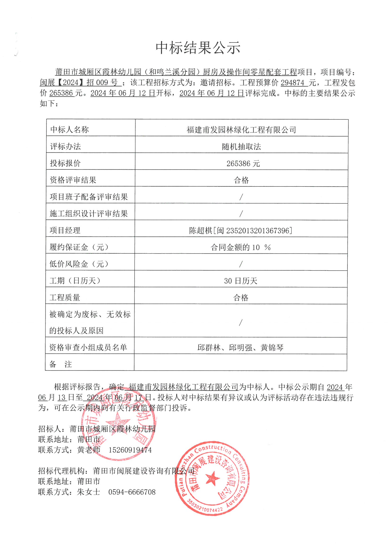【中标公告】城厢区霞林幼儿园(和鸣兰溪分园)厨房及操作间零星配套工程