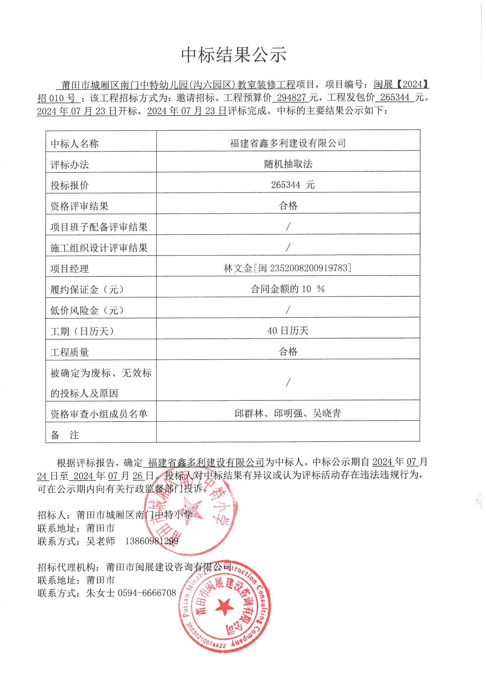 【中标公告】莆田市城厢区南门中特幼儿园(沟六园区)教室装修工程