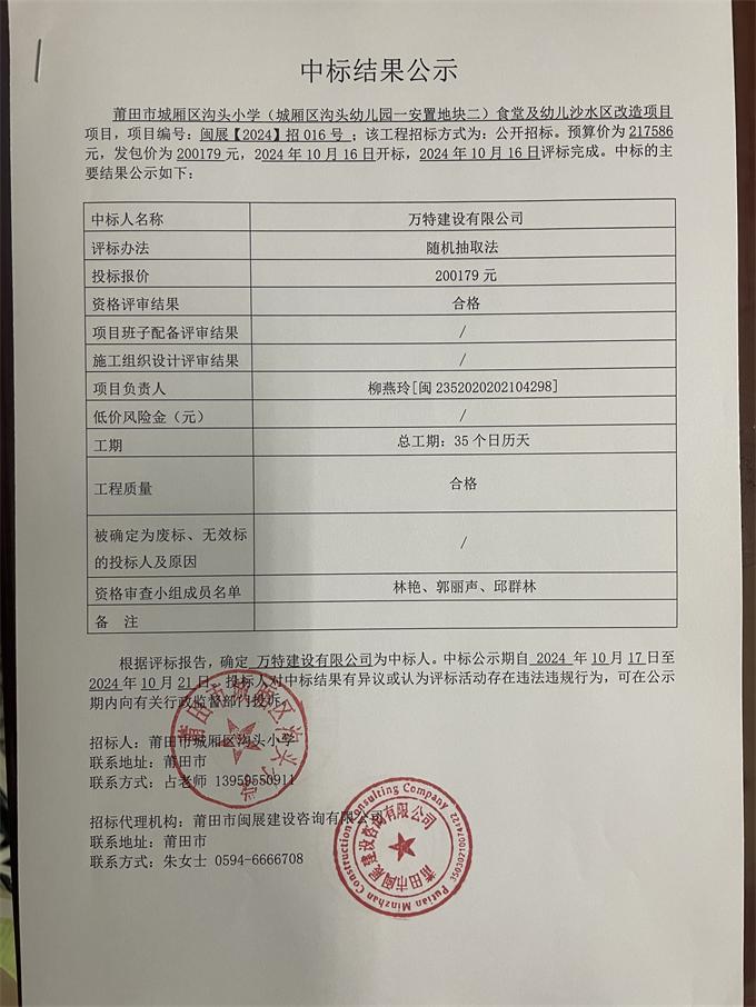 【中标公告】城厢区沟头小学(城厢区沟头幼儿园一安置地块二)食堂及幼儿沙水区改造项目