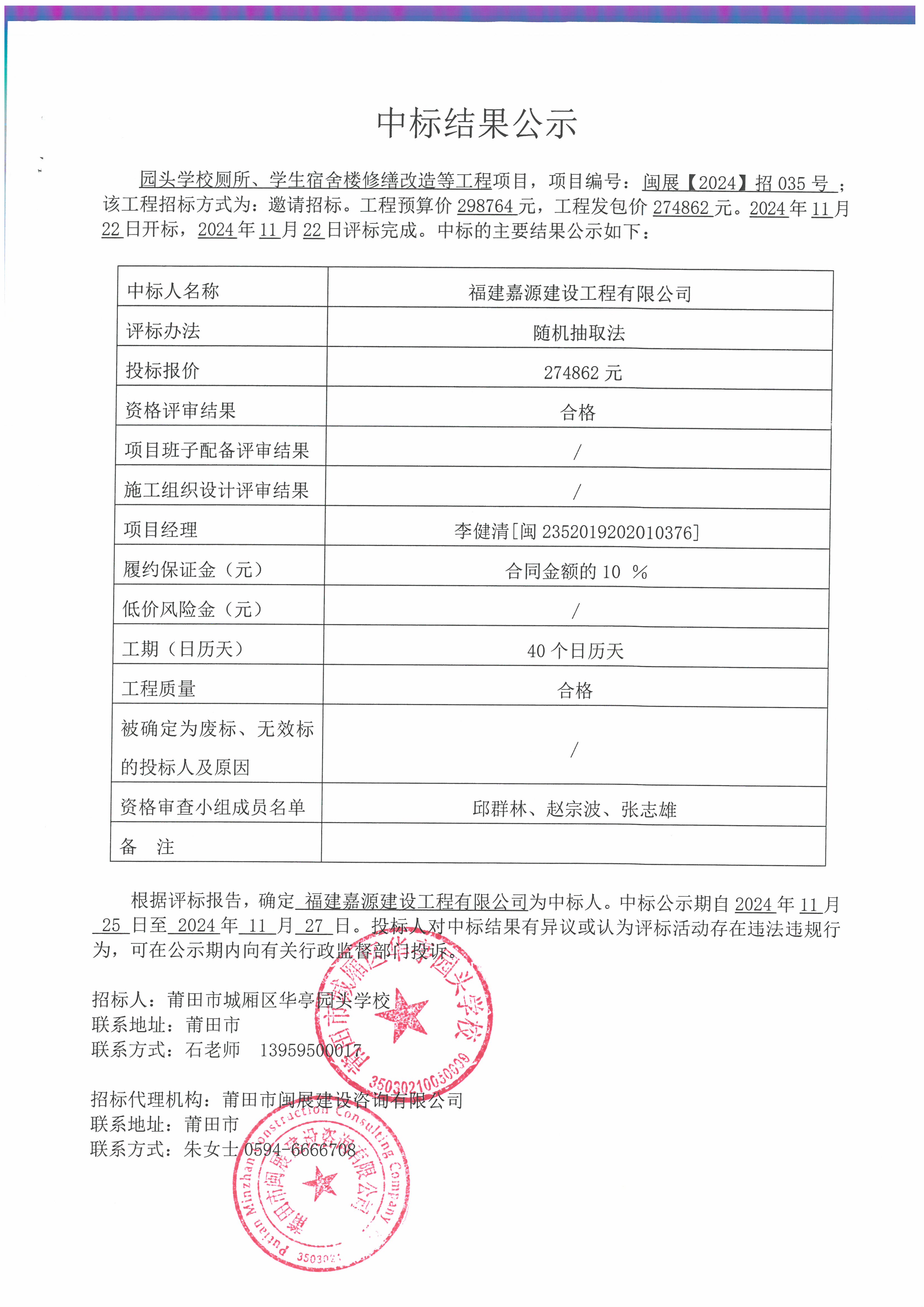 【中标公告】城厢区园头学校厕所、学生宿舍楼修缮改造等工程