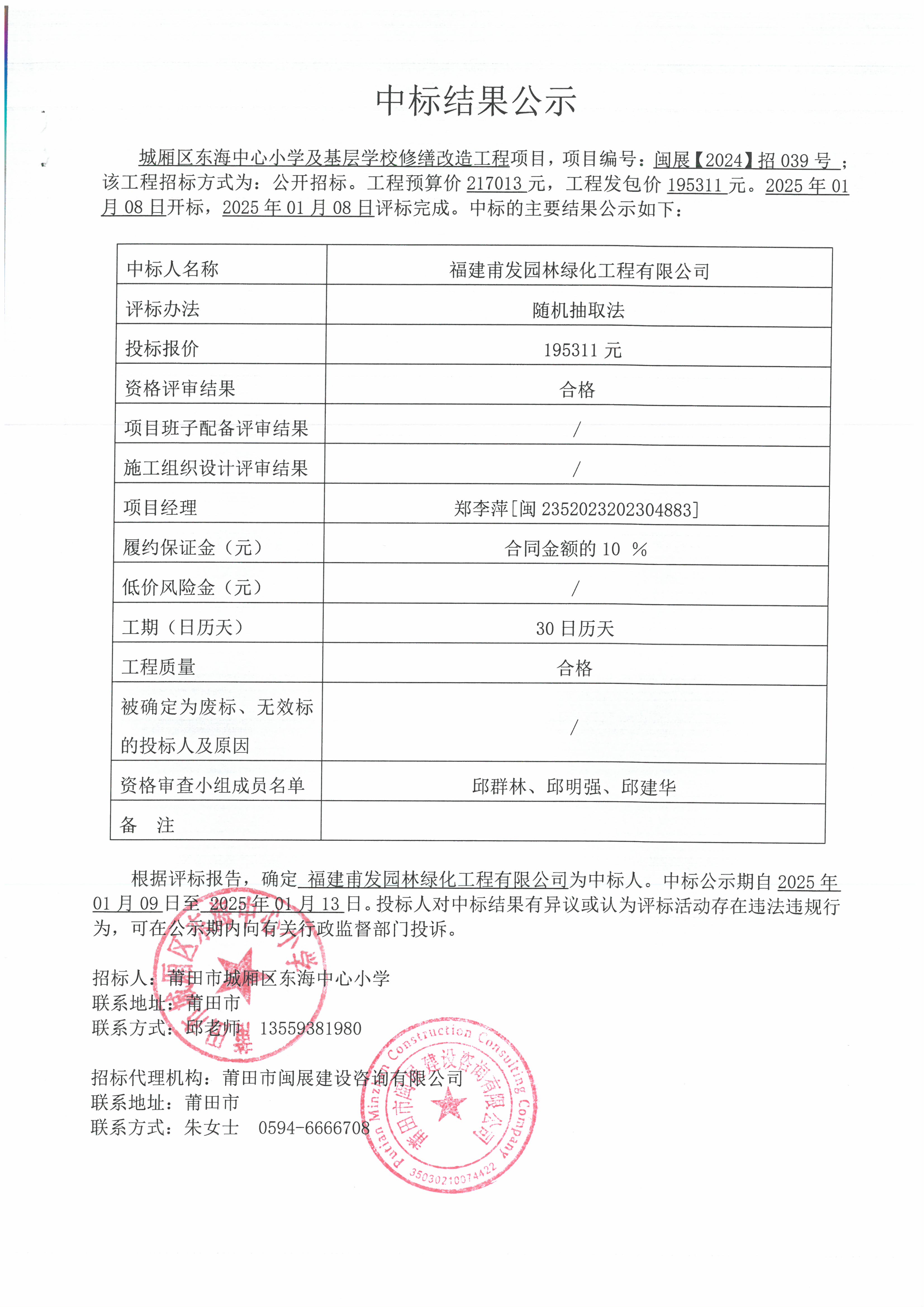 【中标公告】城厢区东海中心小学及基层学校修缮改造工程