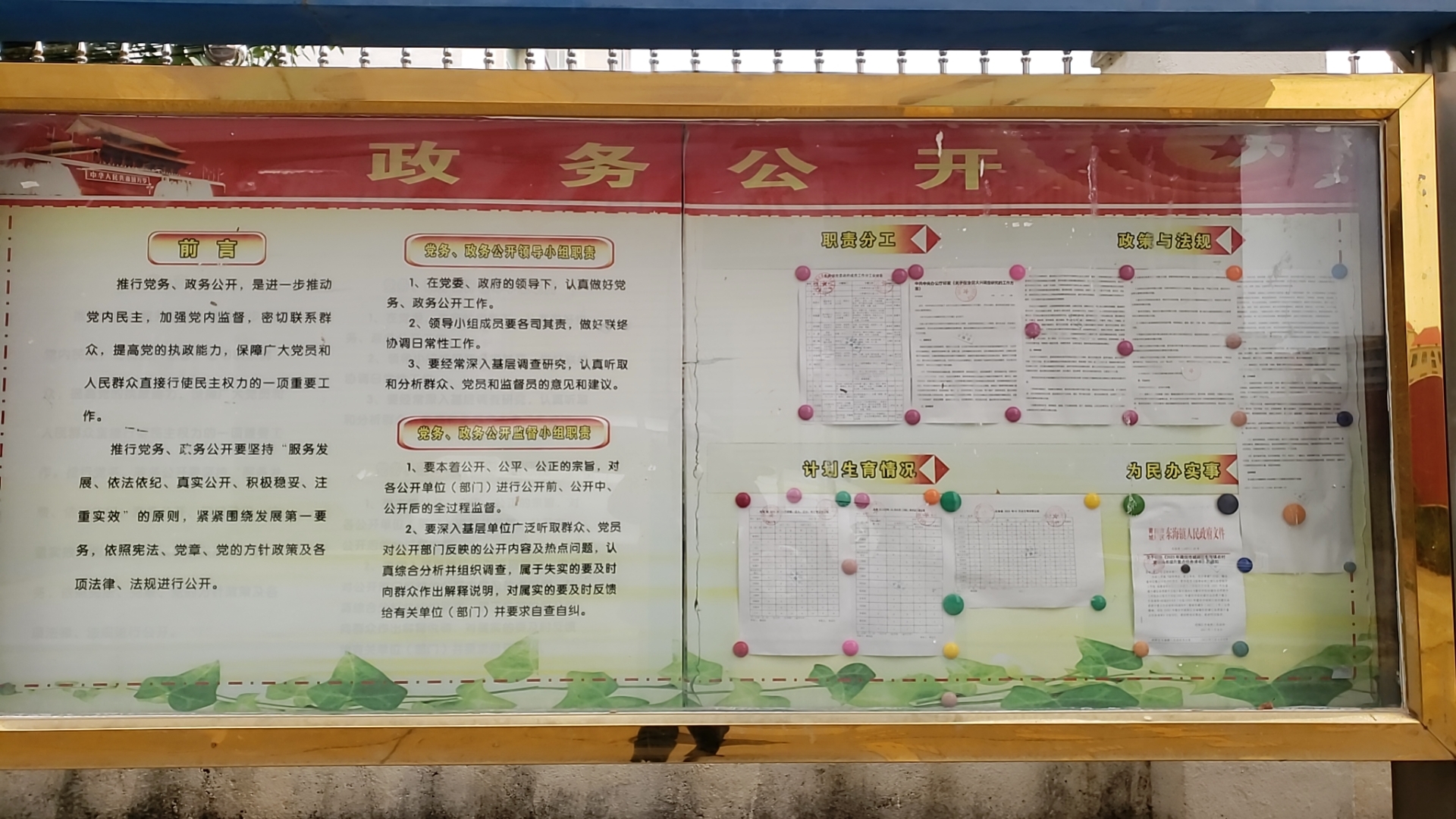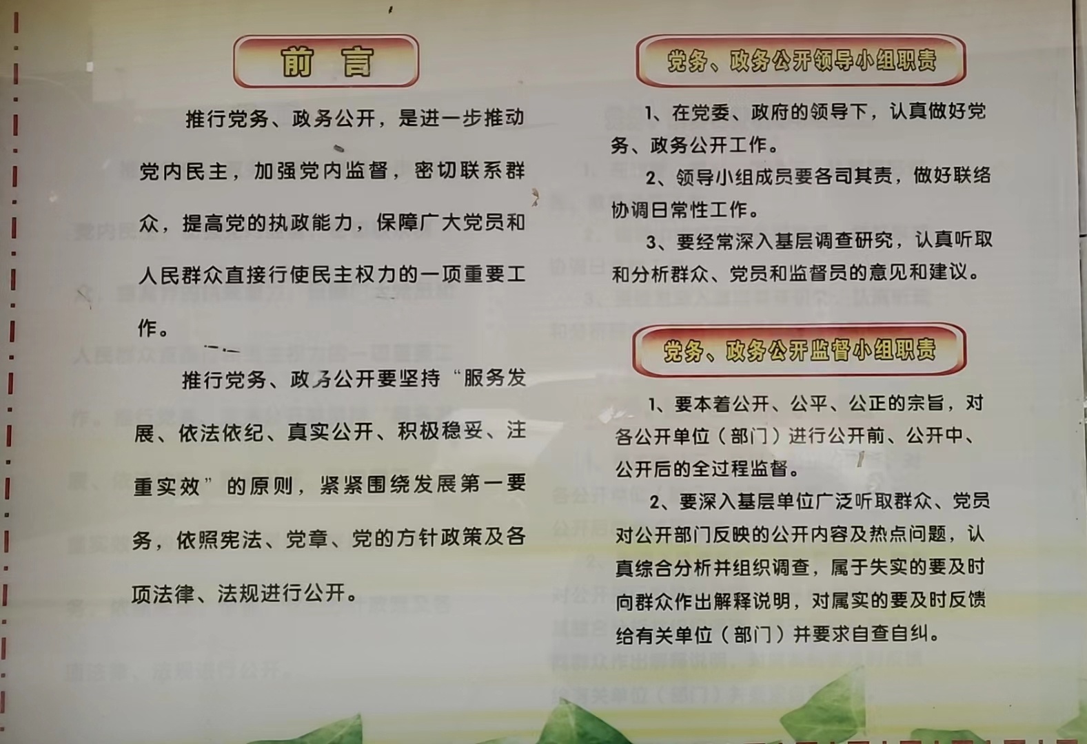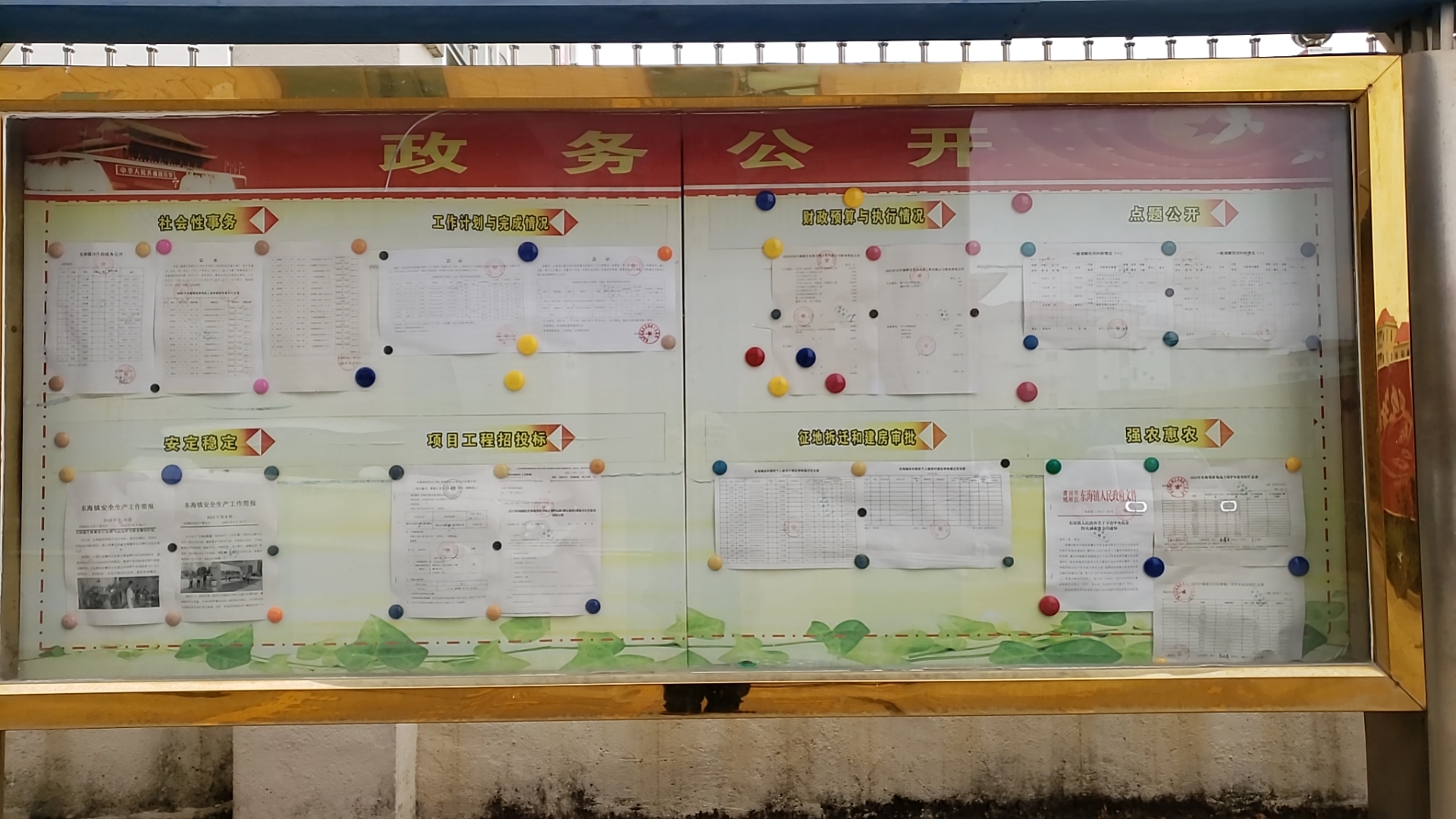 镇公开栏共分为两大板块,即对内和对外公开栏。对内公开内容包括政策方案、廉洁自律、“三公”经费、人员考勤、人事奖惩、政府公报、通知等,对外公开包括党务公开和政务公开,其中政务公开包括职责分工、政策法规、计划生育、为民办实事、社会性事物、工作计划与完成情况、安定稳定、招投标、财务、点题、建房审批、强农惠农等,按相关规定要求在相应栏目及时更新张贴信息。