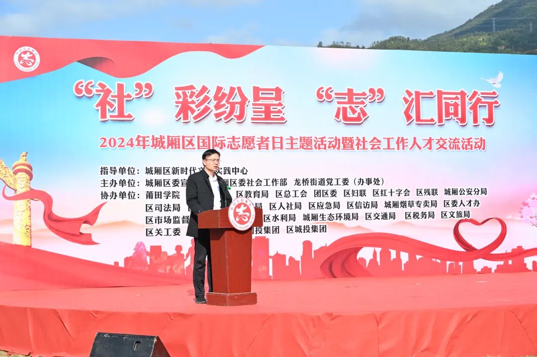 为深入学习贯彻习近平总书记对社会工作重要指示和关于志愿服务工作的重要论述精神,推动全区志愿服务事业和精神文明建设迈上新台阶,在第39个“国际志愿者日”来临之际,12月3日,一场由城厢区新时代文明实践中心、城厢区委宣传部、城厢区委社会工作部、龙桥街道党工委(办事处)等单位共同举办的“社”彩纷呈 “志”汇同行——2024年城厢区国际志愿者日主题活动暨社会工作人才交流活动在泗华郊野公园举行。区委副书记黄云鸿,区人大常委会副主任王乌妹,区政府副区长、公安分局局长庄国辉,区政协副主席黄斌华等领导出席活动。