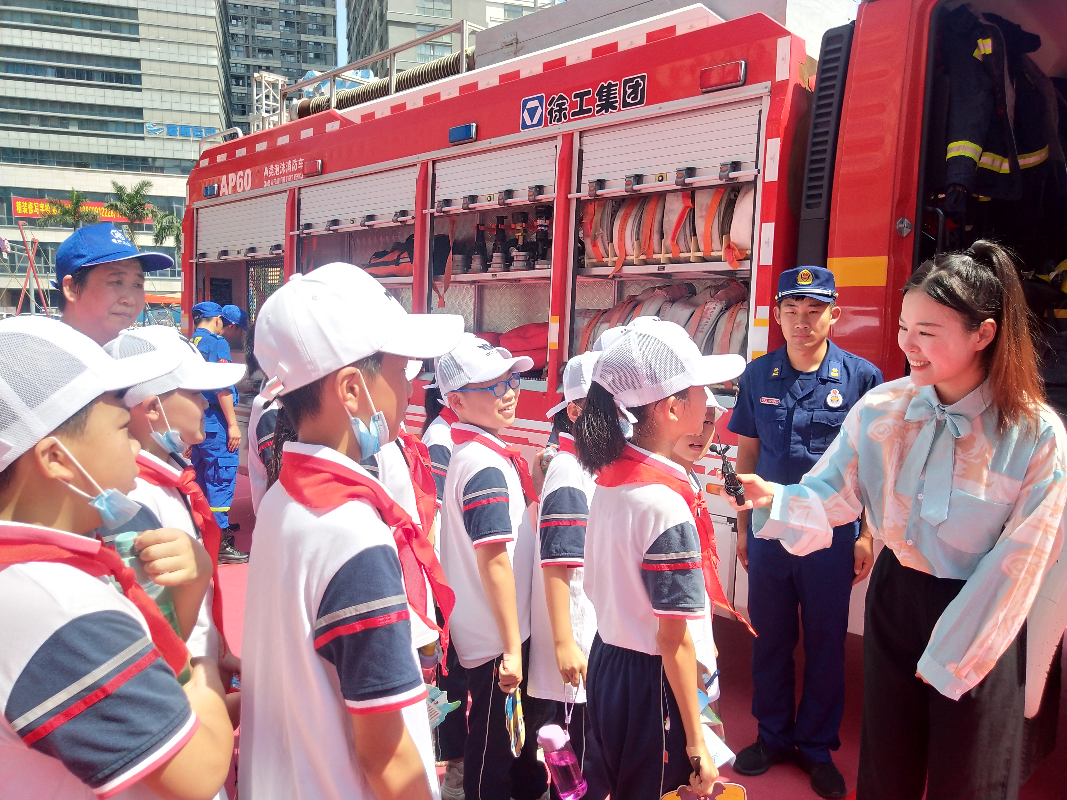 在消防救援大队宣传摊位点上,各种各样有趣的小游戏轮番上演,寓教于乐,让群众在积极参与的过程中,更好地了解宣传内容。城厢区华林消防站消防员详细介绍消防车的构造配备,并让现场学生和群众上车参观体验。