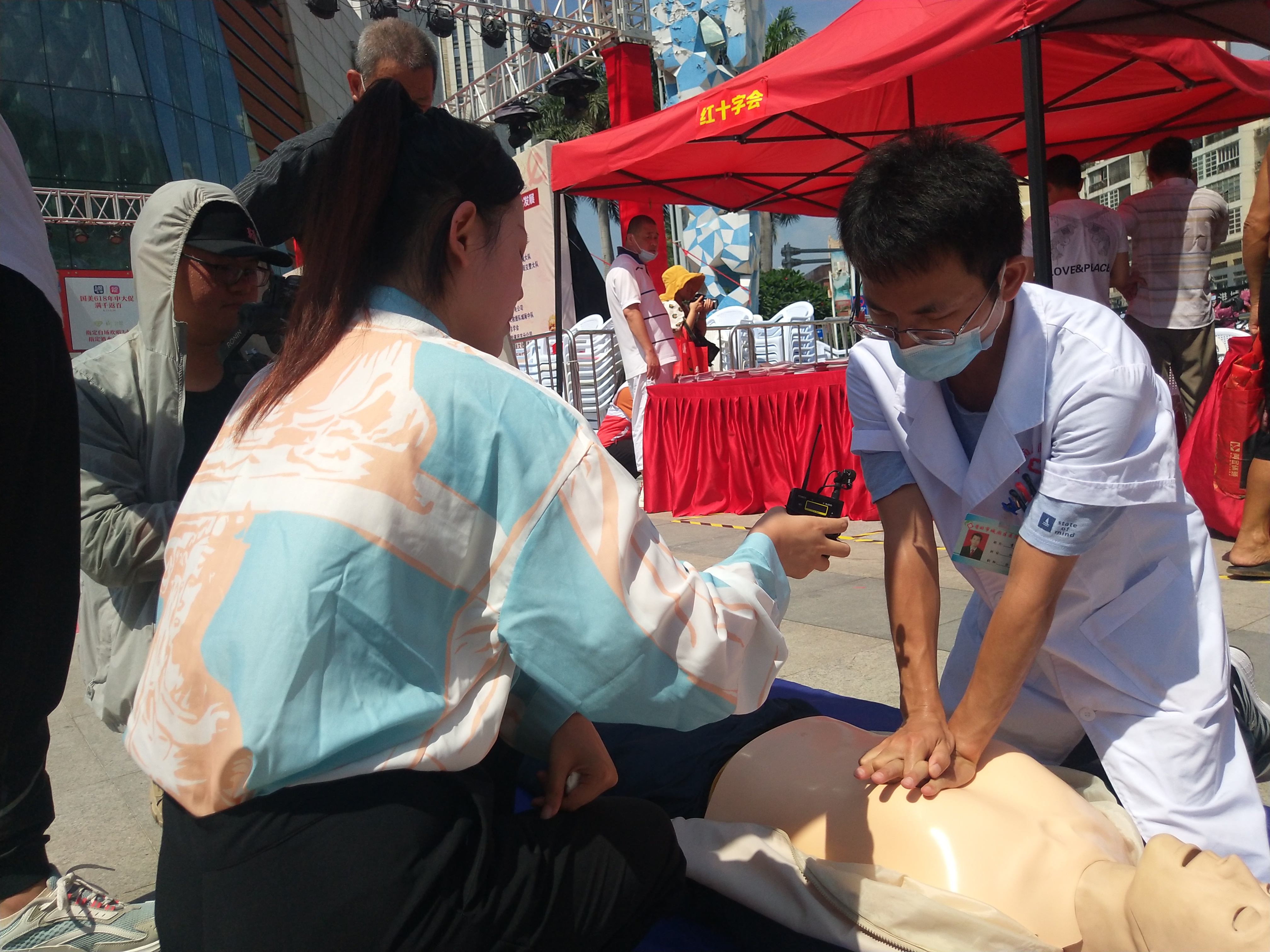 现场,由城厢区医院医务人员演示的心肺复苏、伤口包扎和“海姆立克急救法”格外引人注目。医务人员边介绍边演示,吸引不少市民驻足观看。