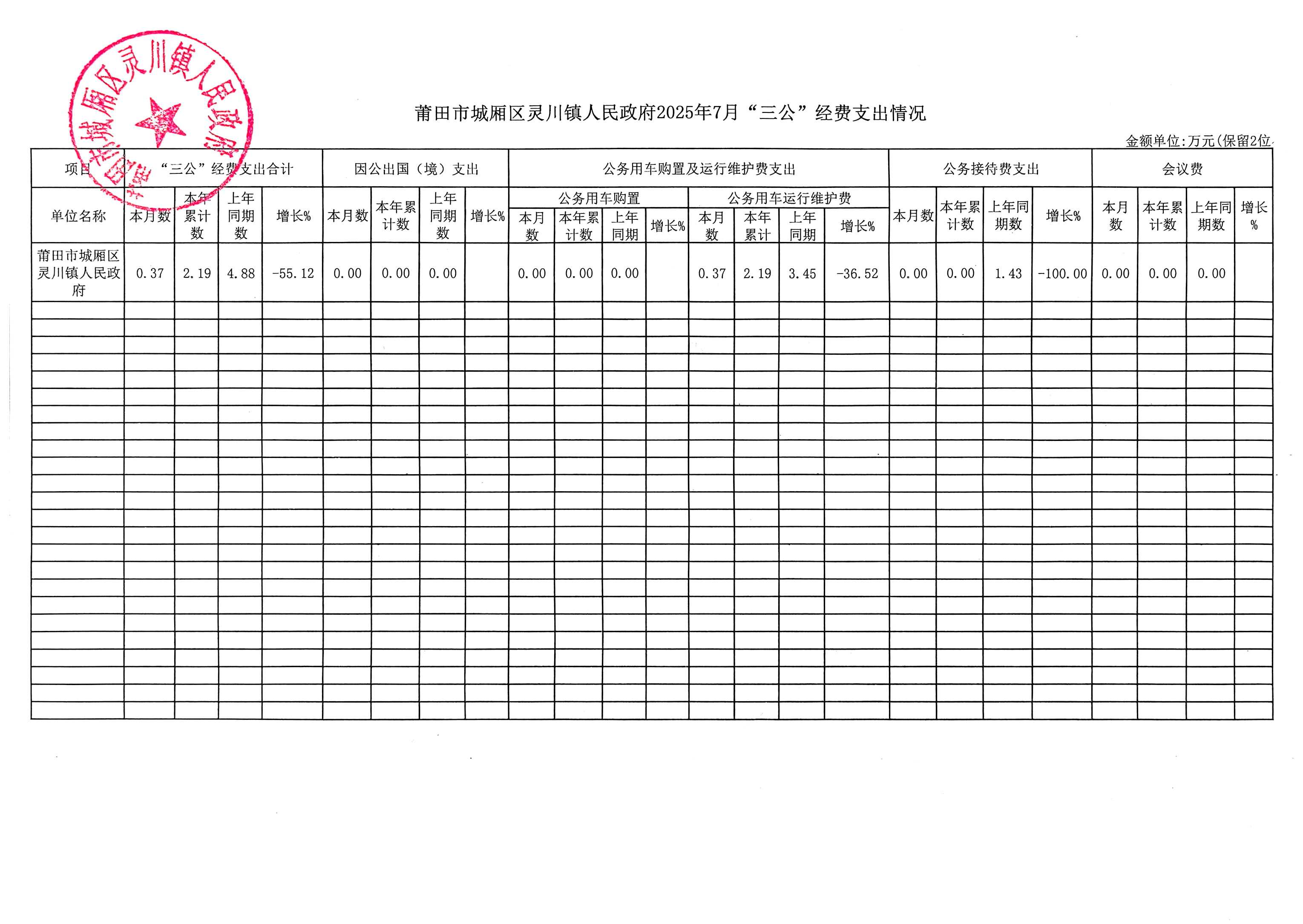 莆田市城厢区灵川镇人民政府2025年7月份“三公”经费支出情况