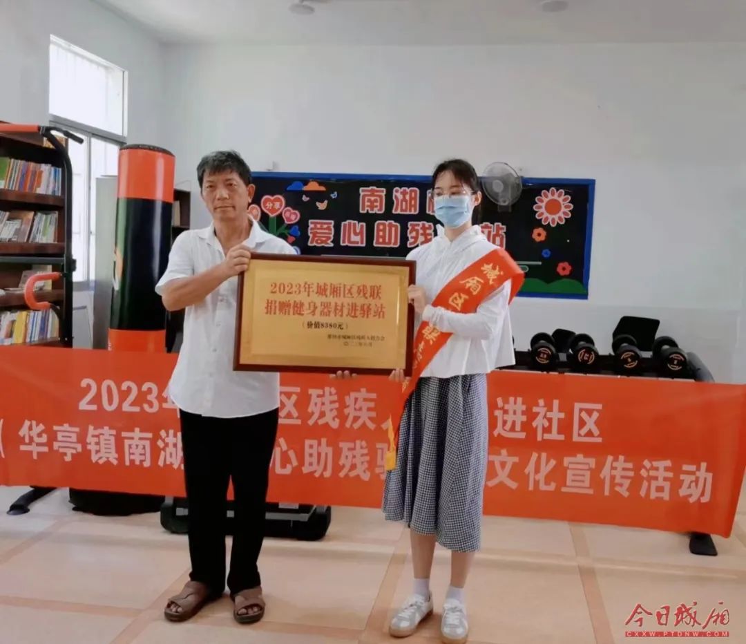 据悉,此次活动为两个“爱心助残驿站”捐赠总价值11180元的残疾人健身器材。其中,向南湖村“爱心助残驿站”捐赠电动跑步机1台、哑铃组合1套,向云峰村“爱心助残驿站”捐赠背部伸展练习器 1台。同时,还为两个驿站内的12名残疾人每人赠送1套励志书籍。
