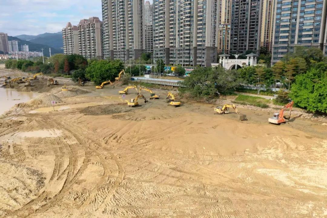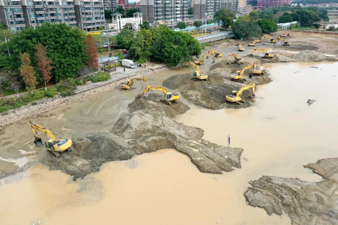 连日来,在延寿溪城厢区龙桥街道泗华段,十几台挖掘机在已抽干的河床上“火力全开”,紧锣密鼓进行清淤作业(如图)。