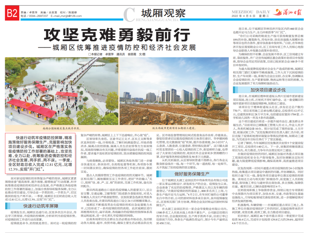 快速行动筑牢疫情防控屏障,精准施策做好服务保障生产,克服影响加快项目建设步伐。城厢区在严格落实各级疫情防控工作部署的基础上,攻坚克难,全力以赴,统筹推进疫情防控和经济社会发展,两手抓,两不误。一季度,全区财政总收入完成12.81亿元,比增12.3%,实现“开门红”。