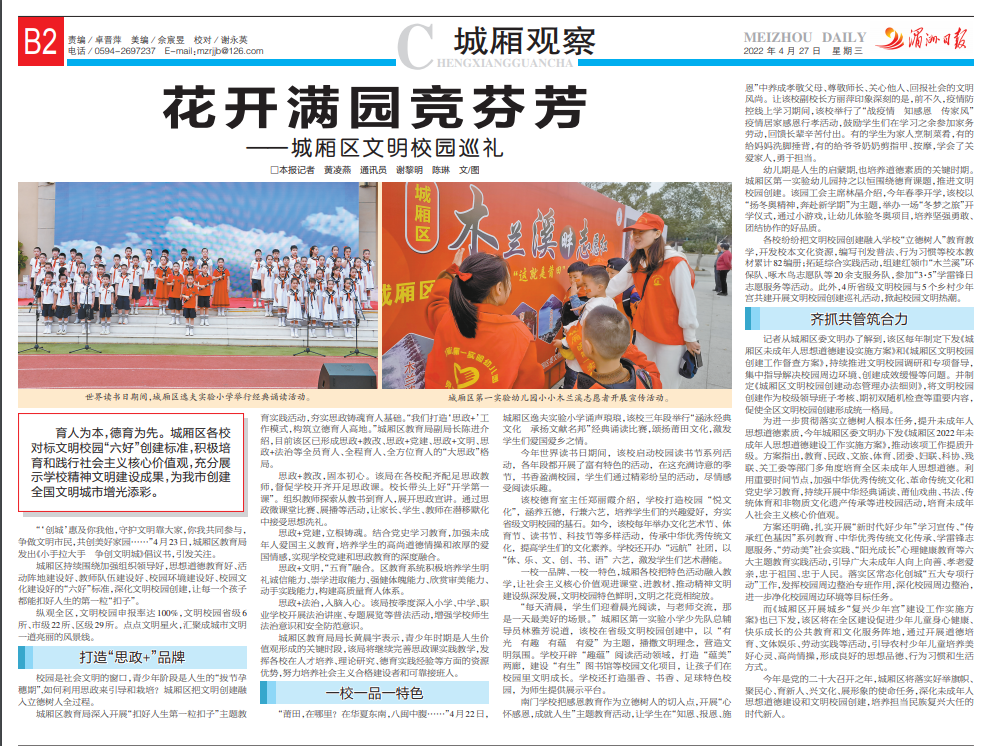 育人为本,德育为先。城厢区各校对标文明校园“六好”创建标准,积极培育和践行社会主义核心价值观,充分展示学校精神文明建设成果,为我市创建全国文明城市增光添彩。