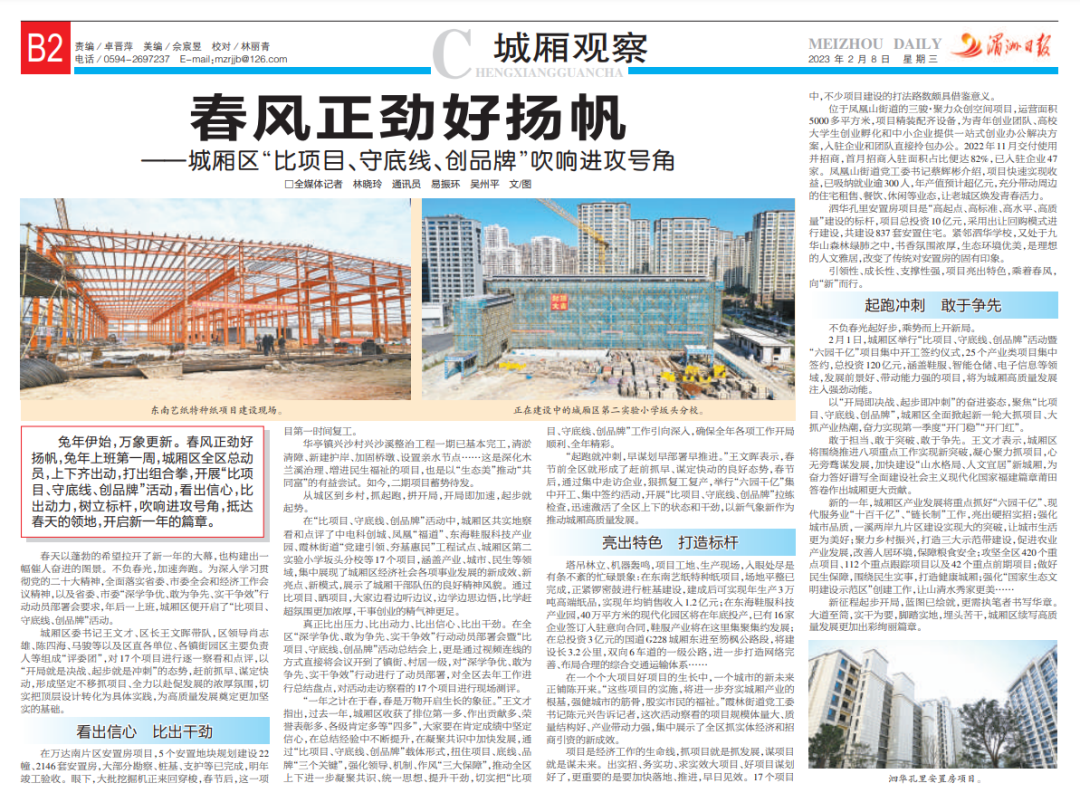 春天以蓬勃的希望拉开了新一年的大幕,也构建出一幅催人奋进的图景。不负春光,加速奔跑。为深入学习贯彻党的二十大精神,全面落实省委、市委全会和经济工作会议精神,以及省委、市委“深学争优、敢为争先、实干争效”行动动员部署会要求,年后一上班,城厢区便开启了“比项目、守底线、创品牌”活动。