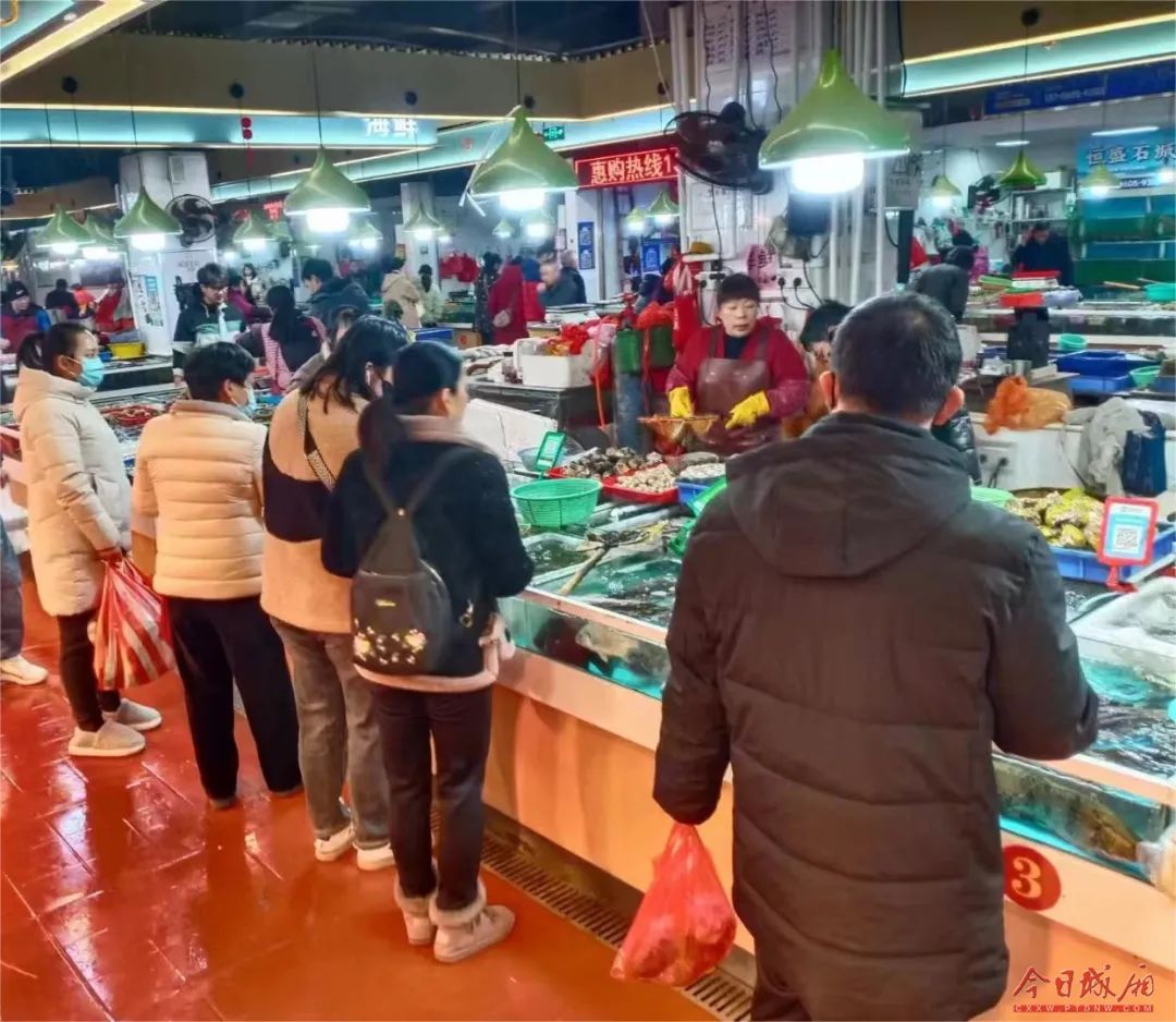 2月4日,在筱塘市场,笔者看到市场上前来采购商品的顾客络绎不绝,蔬菜区、生鲜区、肉类区、水果区人来人往,选菜、挑肉、抓海鲜称重、装货,一片火热景象。