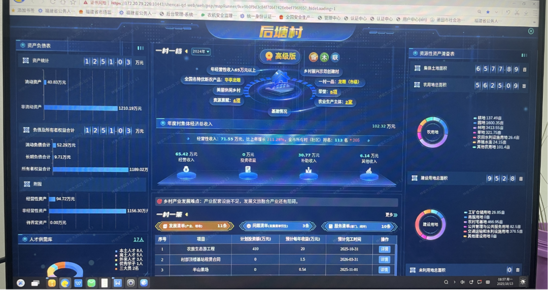 今年以来,在市委组织部、市委农办和市农业农村局的协同推动下,城厢区持续优化“全市一张图”乡村振兴模块,深入推进“一村一档”“一村一策”工作。借助“三资”监管模块,相关部门可清晰掌握各村(居)发展现状与集体资产情况,推动决策更加精准、资源配置更加高效。城厢区依托“全市一张图”平台基础,持续完善“一村一档”数据体系,积极探索构建“一村一策”工作模式。