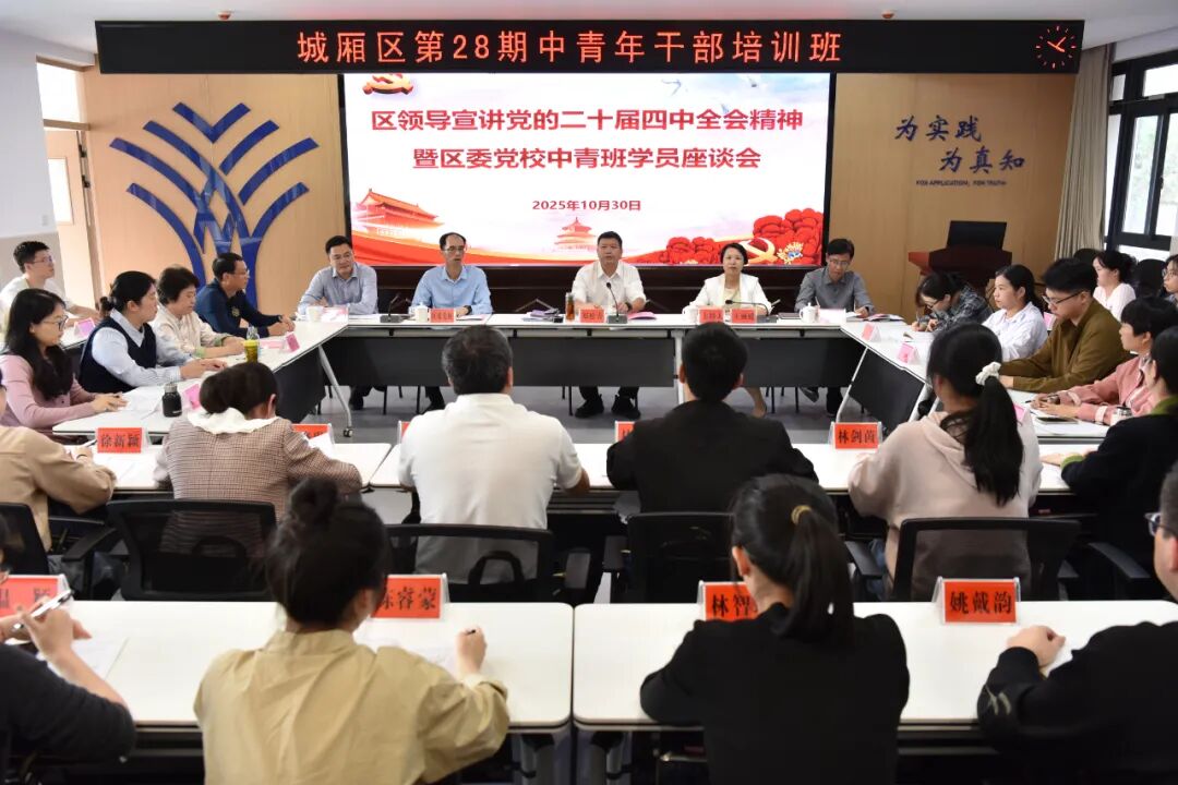 在座谈会上,学员代表围绕学习宣传贯彻党的二十届四中全会精神,落实区委“七大行动”,结合自身工作职责,就如何担当作为,为打造“和美莆田、共同富裕”首善之区贡献力量谈思想、谈体会、谈认识。郑松青认真听取大家发言,了解年轻骨干的所思所想,对学员们近阶段的学习成效给予了肯定。他要求青年干部要珍惜学习机会,把思想和行动统一到党的二十届四中全会部署上来,把智慧和力量凝聚到“七大行动”的实践中去,在打造“和美莆田、共同富裕”首善之区新愿景中展现新担当、实现新作为。