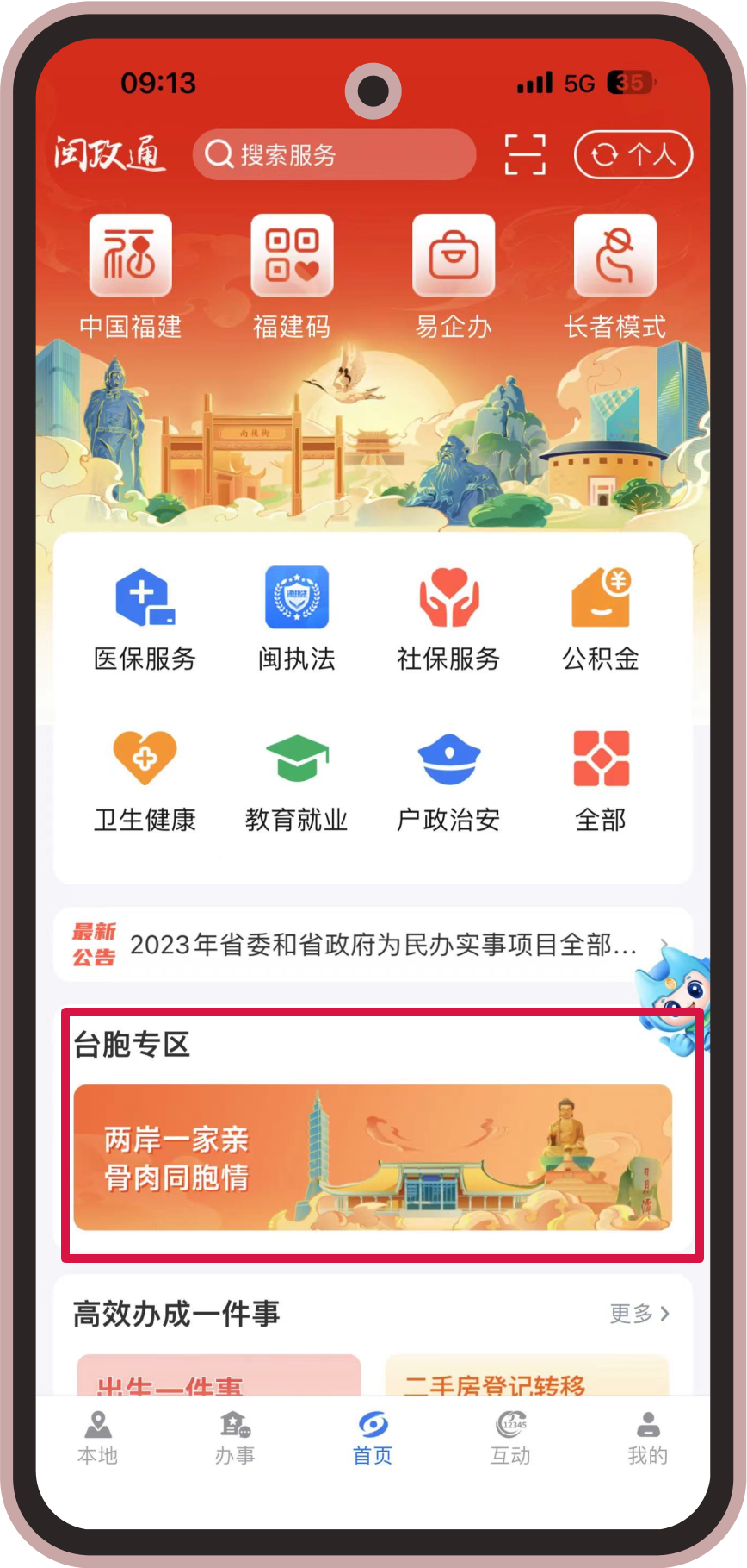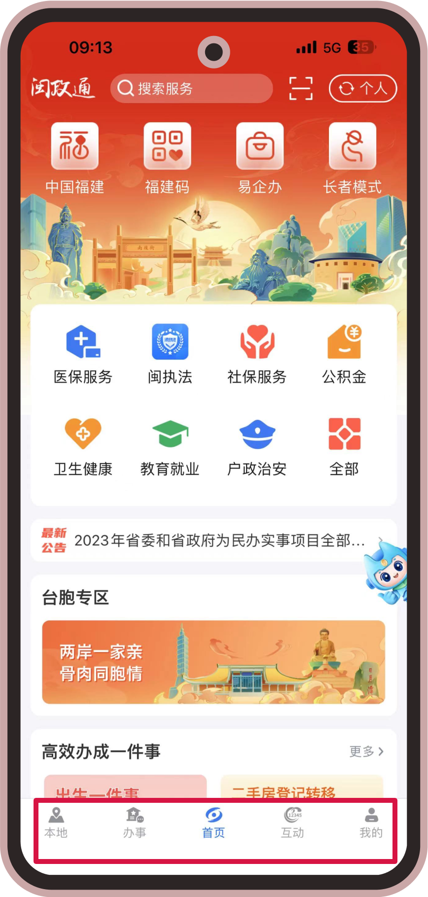 新版闽政通APP充分尊重用户需求,采用更为简洁明亮的界面设计,合理分布“闽政通”功能布局,设置本地、办事、首页、互动和我的五大版块,使功能更清晰、操作更流畅。“本地”版块,连通省市入口,将展示九市一区本地化特色服务;“办事”版块,聚焦企业和群众办事,按主题、部门、个人对服务分类,方便用户快速查找,实体大厅根据用户位置展示附近办事地点,并提供导航功能;“首页”版块,精选高频服务、台胞服务、高效办成一件事、专题服务以及部门服务;“互动”版块,接入12345服务热线,提供业务咨询、投诉、意见征集、网上调查等服务;“我的”版块,是用户专属空间,集中汇聚展示用户电子证照、办件情况、投诉建议等个人数据。