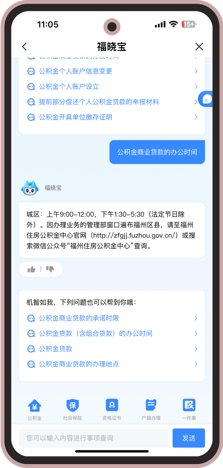 服务有疑问?智能客服来帮您!新版闽政通APP创新人工智能服务应用,引入目前热门的大模型、自然语言处理等人工智能技术,全新打造了智能客服——“福晓宝”,致力打造全场景、交互式、更精准的智能服务新体验,“福晓宝”目前可覆盖服务全省公积金、社保等8000多个政务事项和便民应用。