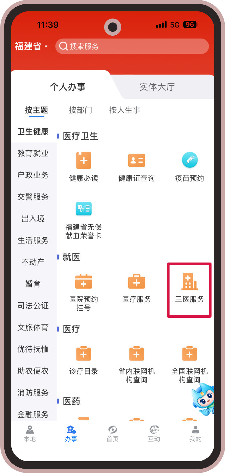 聚焦与企业和群众生产生活密切相关的高频服务事项,以20%高频服务满足80%用户需求。“闽政通”集中打造了一批关系企业和群众切身利益的热点服务应用,涵盖了医保、社保、公积金、公安、教育、交通出行、卫生健康等领域,方便企业和群众全流程网上办理。在“首页”版块上线了395项高频服务应用,各地又结合本地实际,在“本地”版块另外推出了374项高频便民服务应用。特别是,在卫生健康模块新增了“三医服务”,实现131家二级以上公立医疗机构线上预约挂号和266家医疗机构检查检验查询互认;在“本地”版块各地均接入了公交地铁应用,提供实时公交查询、乘车等服务。