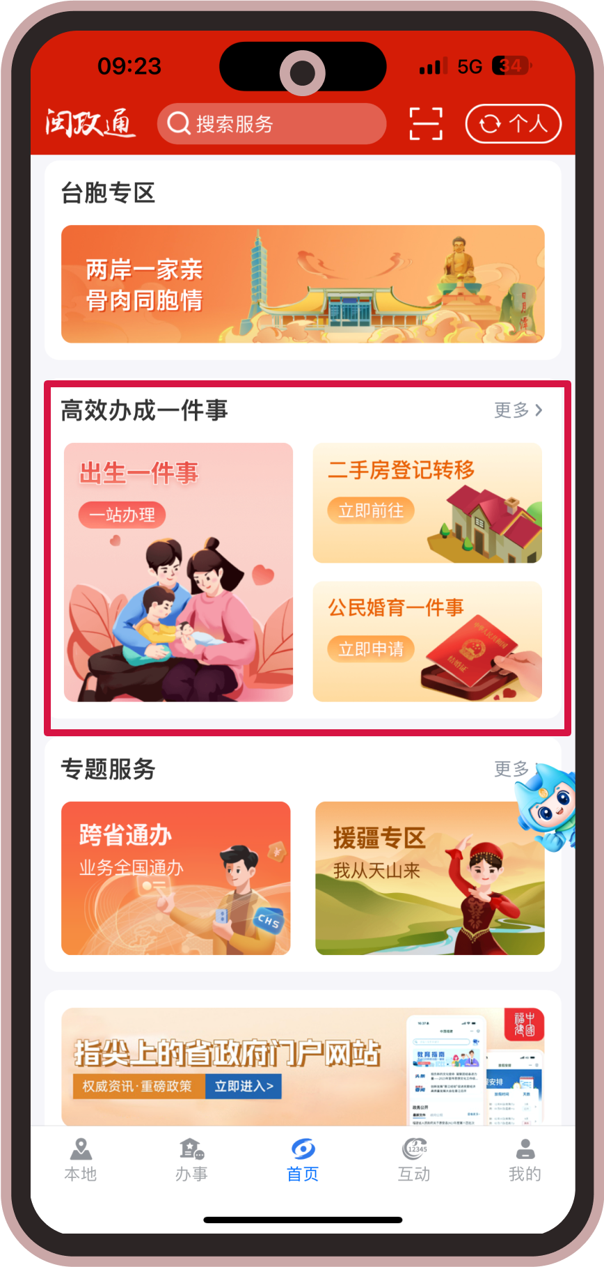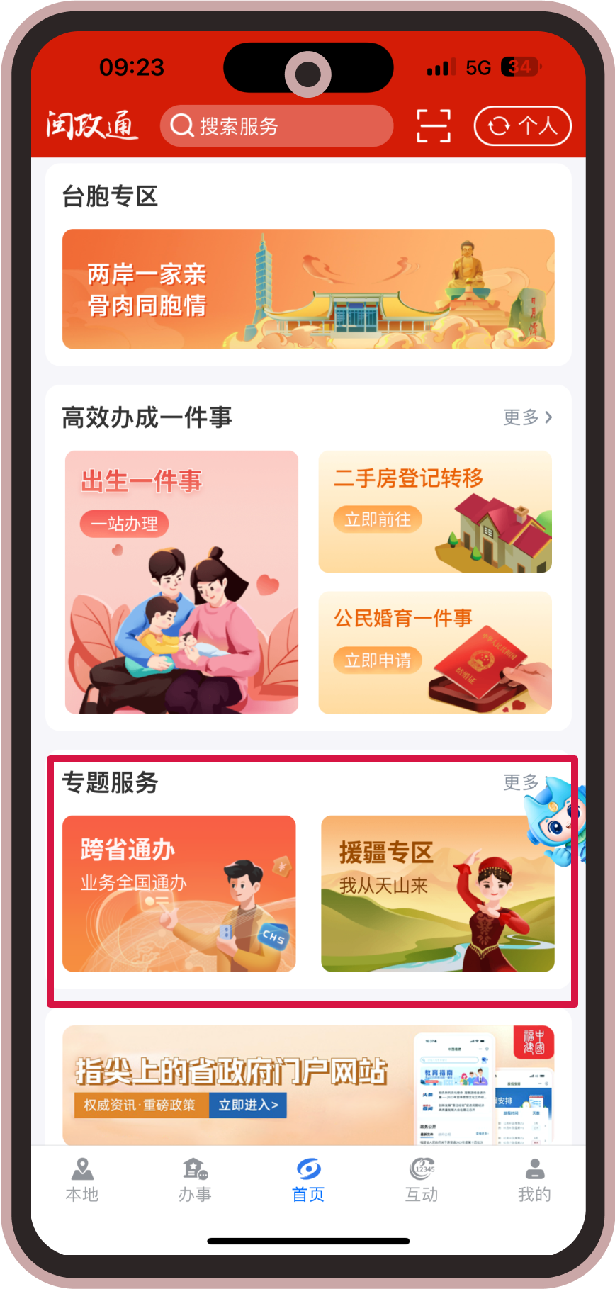 发挥区位优势,打造特色服务。发挥福建区位优势,整合各类资源,设立“台胞专区”,为台胞台企提供办事服务、政策解读、台海资讯等一站式服务,助力建设台胞台企登陆第一家园。首批推出了27项政务服务事项,涵盖教育、登陆证核发、机构办学许可、培训项目审批等,方便台胞台企办事服务。开设“援疆专区”,搭建“闽昌招商”“闽昌通办”“闽昌经验”三块服务,实现重点产业招商政策的一键查询、跨省高频事项移动端办理以及福建援昌经验的交流展示。“跨省通办”专区已接入了8076项跨省通办事项,实现全流程“掌上办”。
