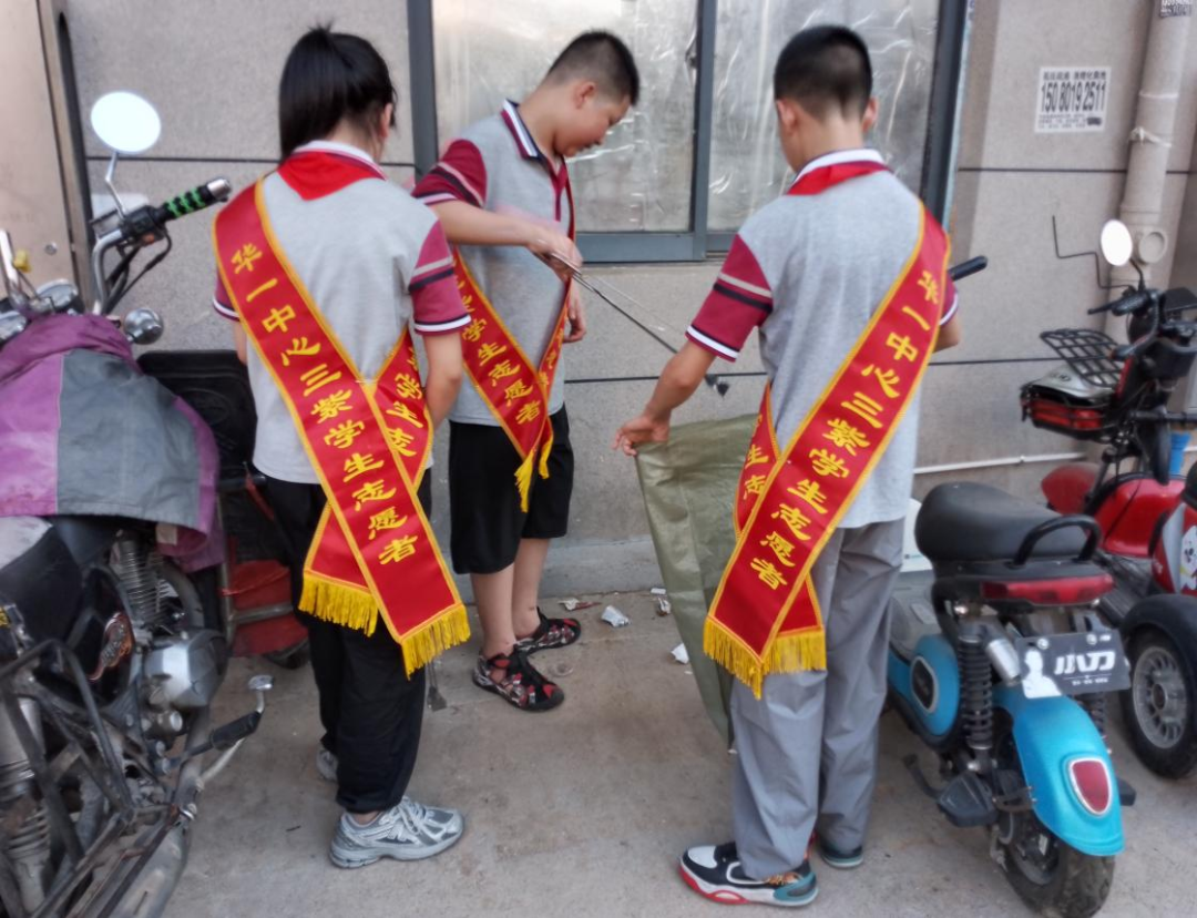 活动现场,孩子们身着整齐的校服,胸前的红领巾鲜艳夺目,身上佩戴的“华一中心三小学学生志愿者”绶带红底金字,格外亮眼。红色横幅上面的“华亭镇‘小手拉大手 共护母亲河’培育践行主流价值观文明实践活动”的黄色文字清晰而醒目,传递出他们守护母亲河的坚定意愿。
