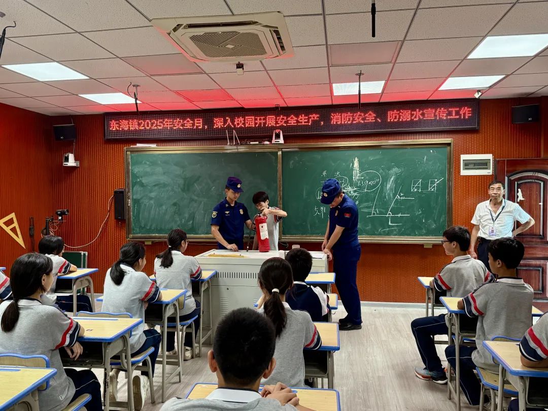 镇安监站与东海消防中队以“理论宣讲+实操演练+隐患排查”三位一体展开宣传活动。安监站负责人以“防溺水”为主题,结合近年来学生夏天水库洗澡溺水等案例,讲解防溺水“六不准”等常识。消防队教官则带来“消防知识脱口秀”,通过模拟火灾报警、讲解灭火器的使用方法,以“提问+演示”的互动方式,让学生更牢固记住“119报警要素”“灭火器使用”等实用技能。课堂宣讲后,安监站负责人带队对校园食堂燃气设施、电气线路、食材品质等重点区域开展安全“体检”,现场排查安全隐患。本次进校安全宣传活动,不仅营造了校园安全文化氛围,助力平安校园建设,而且推动了安全知识从校园向社会辐射,为建设平安东海筑牢根基。