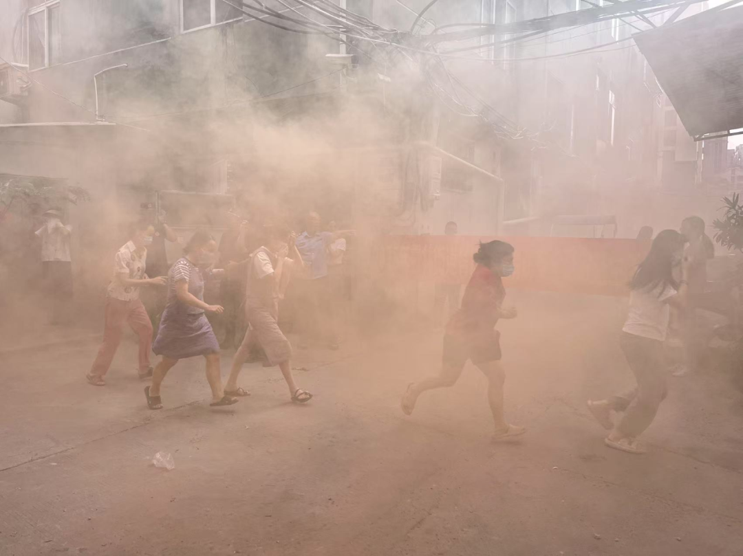 随着消防车汽笛喇叭声响,紧张有序的疏散演练在肖厝社区优克鞋面加工厂内正式启动。为模拟真实火灾场景,厂区内烟雾弹腾起滚滚浓烟,员工们迅速作出反应,用湿毛巾或口罩捂住口鼻,保持弯腰低姿的状态,在指挥人员的有序疏导下,沿逃生通道向安全出口撤离。现场氛围紧张而不慌乱,大家配合默契,高效完成了疏散演练,展现出前期周密的演练筹备和员工们良好的应急素养。