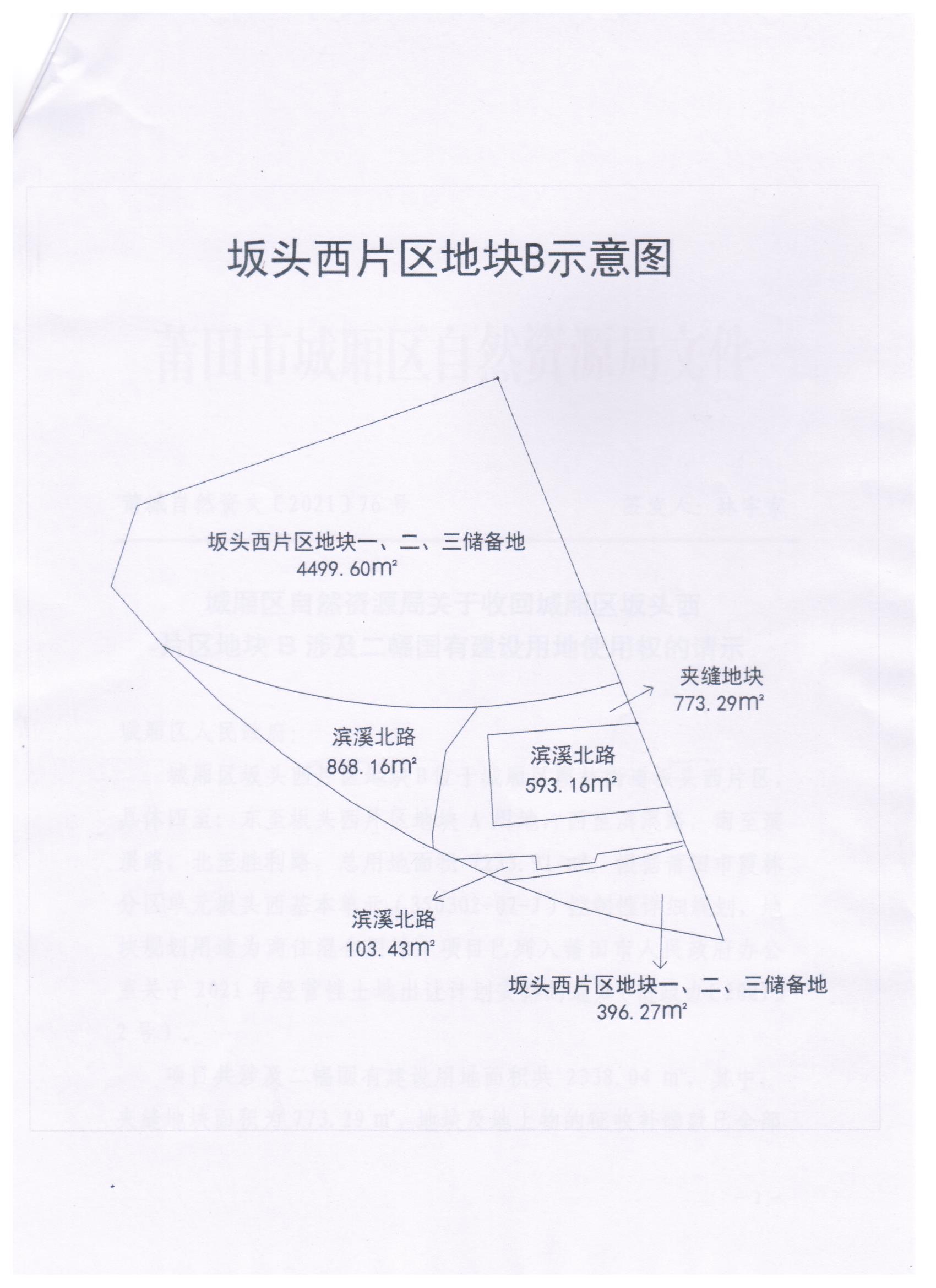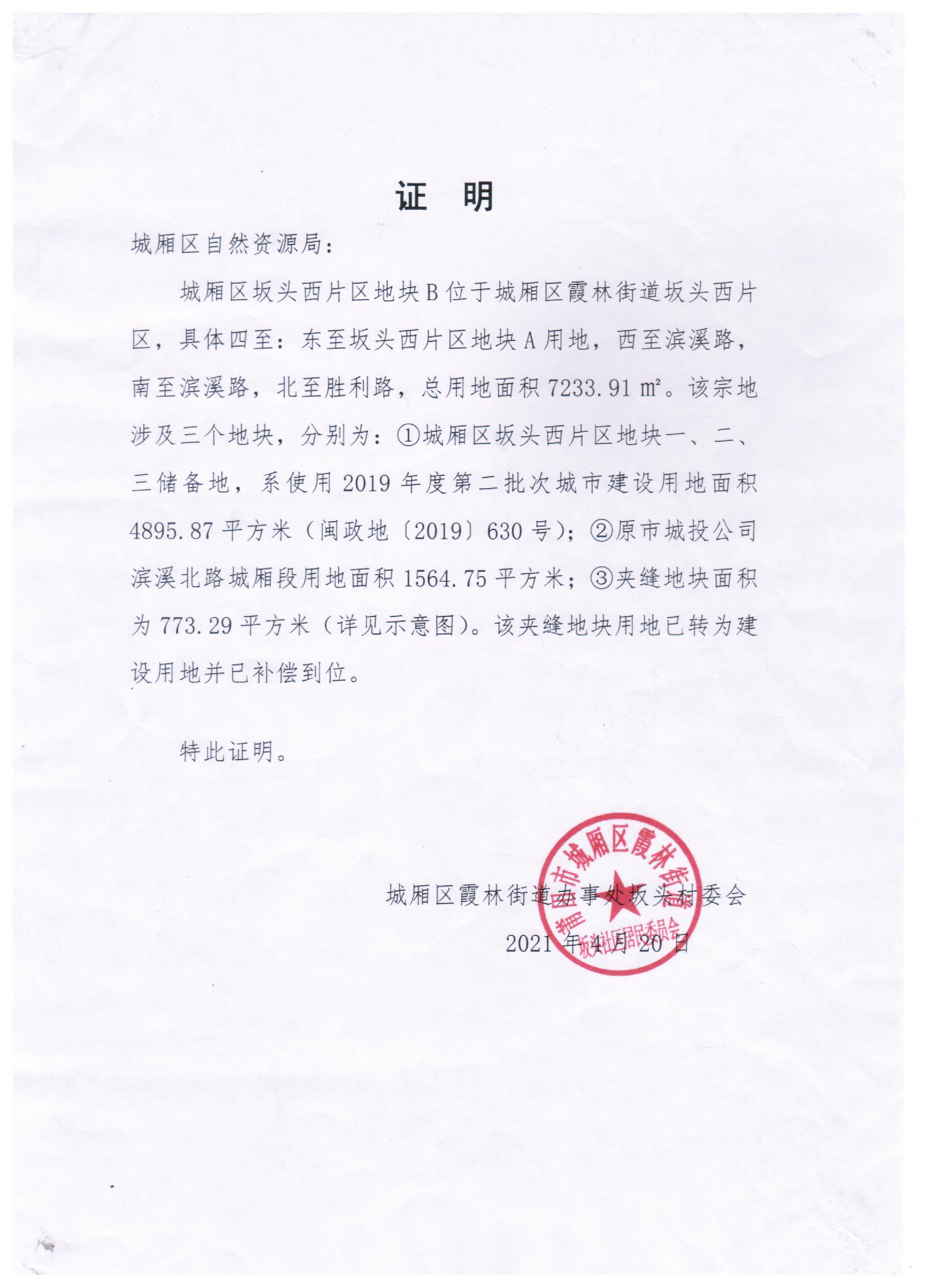 一、经核实,该夹缝地块坐落于城厢区霞林街道坂头村,地块位置详见示意图。用地总面积为773.29㎡,为城市用地已在城市扩展中转为建设用地并实施补偿到位。