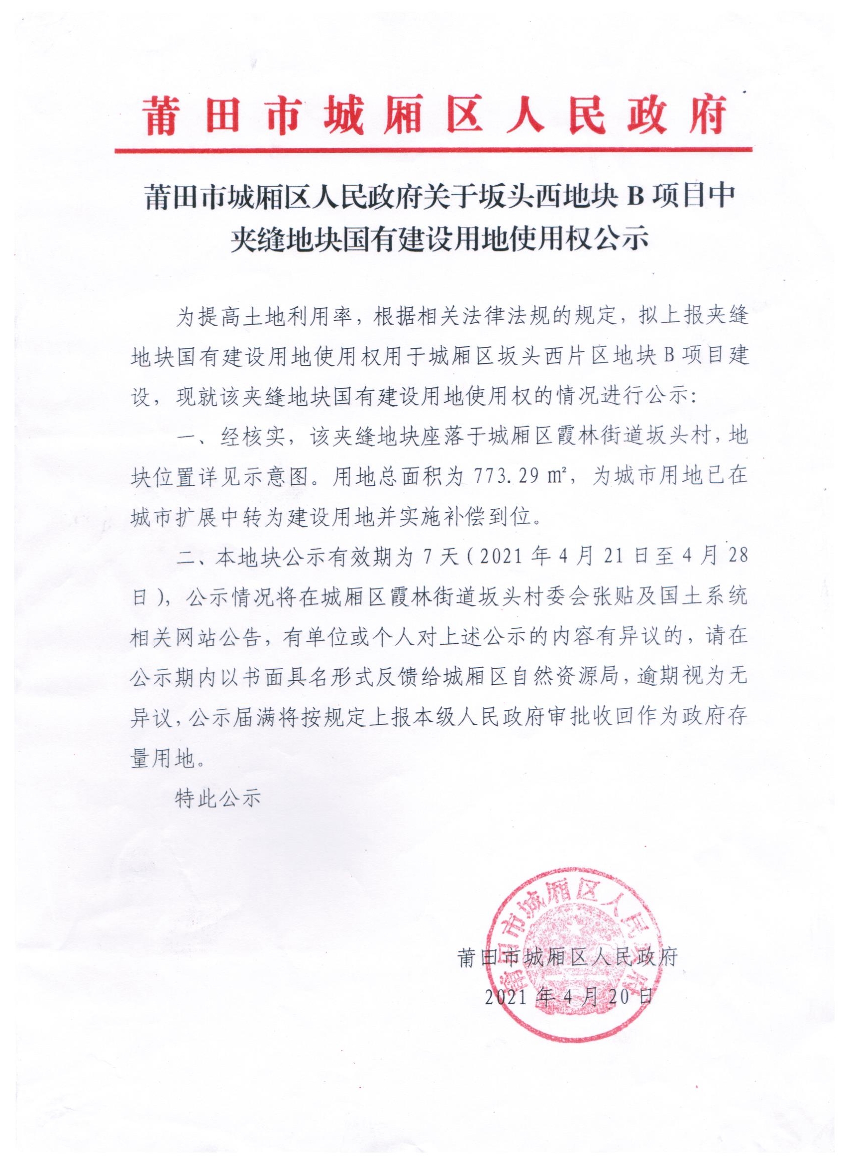 为提高土地利用率,根据相关法律法规的规定,拟上报夹缝地块国有建设用地使用权用于城厢区坂头西片区地块B项目建设,现就该夹缝地块国有建设用地使用权的情况进行公示: