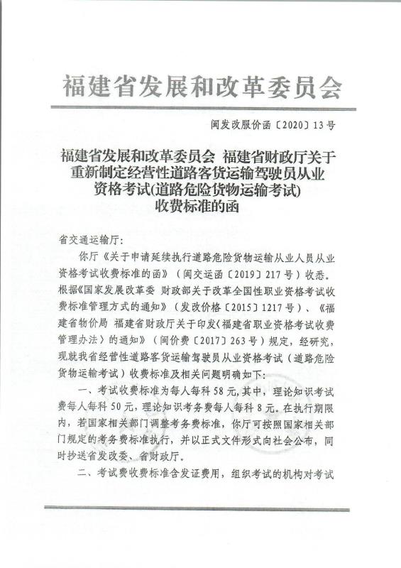 城厢区发展和改革局关于重新制定经营性道路客货运输驾驶员从业资格考试(道路危险货物运输考试)收费标准的函