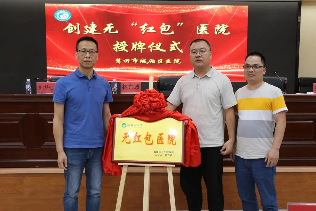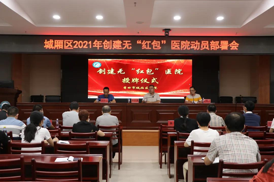 为贯彻落实习近平总书记关于卫生健康工作系列重要论述和重要指示批示精神及来闽考察重要讲话精神,深化医德医风和行业作风建设,不断提高群众就医获得感和满意度,根据创建无“红包”医院相关文件精神,城厢区卫生健康局于6月25日在城厢区医院会议中心召开城厢区创建无“红包”医院动员会,会上为城厢区医院授牌无“红包”医院。城厢区卫健局分管领导、局机关工作人员、城厢区医院领导班子、各镇(中心)卫生院、街道社区卫生服务中心主要领导及城厢区医院医务人员参加会议。