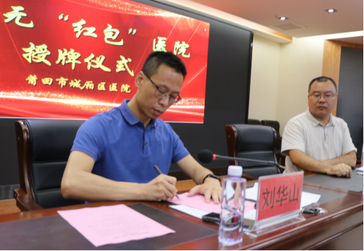 会上,刘华山签署了《创建无“红包”医院社会承诺书》,向社会公开郑重承诺绝不以任何理由和任何方式向患者及家属索取、暗示、收受红包、礼品、有价证券等财物。