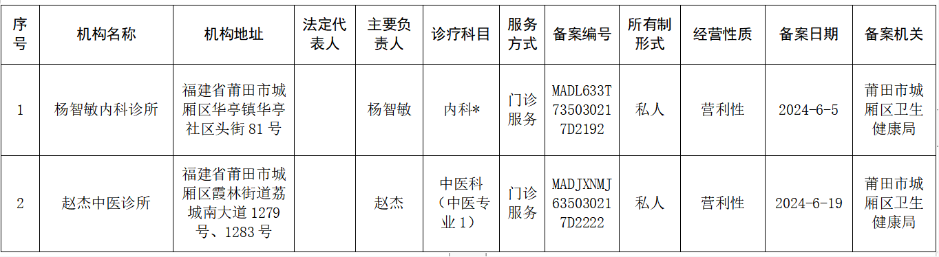 城厢区诊所备案信息公示(2024.6.21)